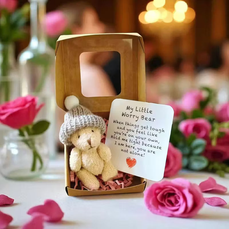 Surprise someone special with this sweet little “Worry Bear” plush — a soft, comforting stuffed animal designed to deliver a hug in disguise. This adorable white or pink bear comes paired with a heartfelt greeting card message, making it a perfect keepsake gift for weddings, Christmas, party favours, best friends, or just because.
